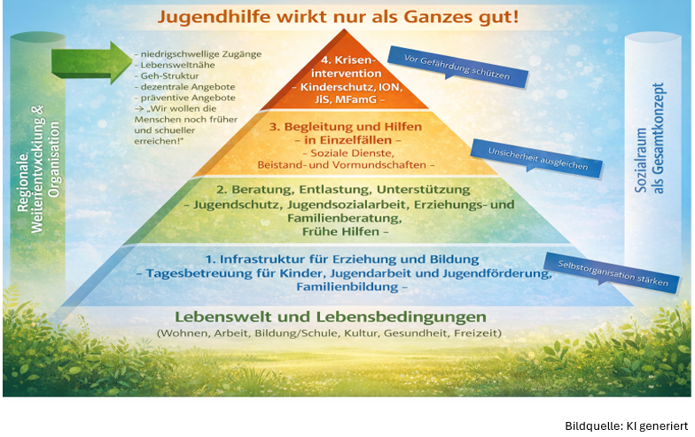 Im Rahmen der Jugendhilfeplanung im Lahn-Dill-Kreis wird für die konzeptionelle Weiterentwicklung einer lebensweltorientierten und inklusiv ausgerichteten Kinder- und Jugendhilfe die Jugendhilfepyramide als fachliche Grundlage herangezogen. Diese verdeutlicht, dass eine wirksame Jugendhilfe im unteren Bereich der Pyramide ansetzt und insbesondere bei präventiven Angeboten wie der offenen Kinder- und Jugendarbeit, den Frühen Hilfen sowie der Erziehungs- und Familienberatung beginnt. Vor diesem Hintergrund verfolgt der Landkreis das Ziel, belastbare präventive Angebote für Kinder, Jugendliche und Familien auszubauen, zu bündeln und zu einer durchgängigen, aufeinander abgestimmten Angebotsstruktur weiterzuentwickeln.